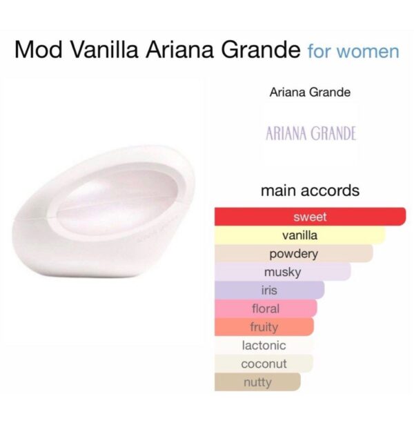 Mod Vanilla by Ariana Grande is a Oriental Vanilla fragrance for women. This is a new fragrance. Mod Vanilla was launched in 2022. Top notes are Musk, plum and Pink Freesia; middle notes are Praline and Orris Root; base notes are Vanilla and Cacao Butter.