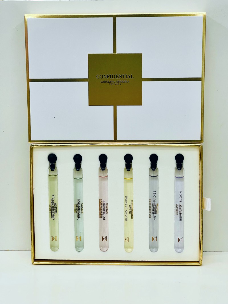 Herrera Confidential Eaux de Toilette line contains six fragrances: Virgin Mint, Rose Cruise, Bergamot Bloom, Vetiver Paradise, Orage Affair and Blond Jasmine.”Inspired by the most luxurious and confidential holiday destinations in South America, this fragrance is a tribute to the iconic flower of Carolina Herrera’s couture inspiration: the imperial jasmine. A floral intensity constrasting with the freshness of vetiver and the softness of white musk. Playful, unexpected and absolutely feminine, this fragrance creates immediate feelings of a mysterious night, full of exotic suprises and happiness.”