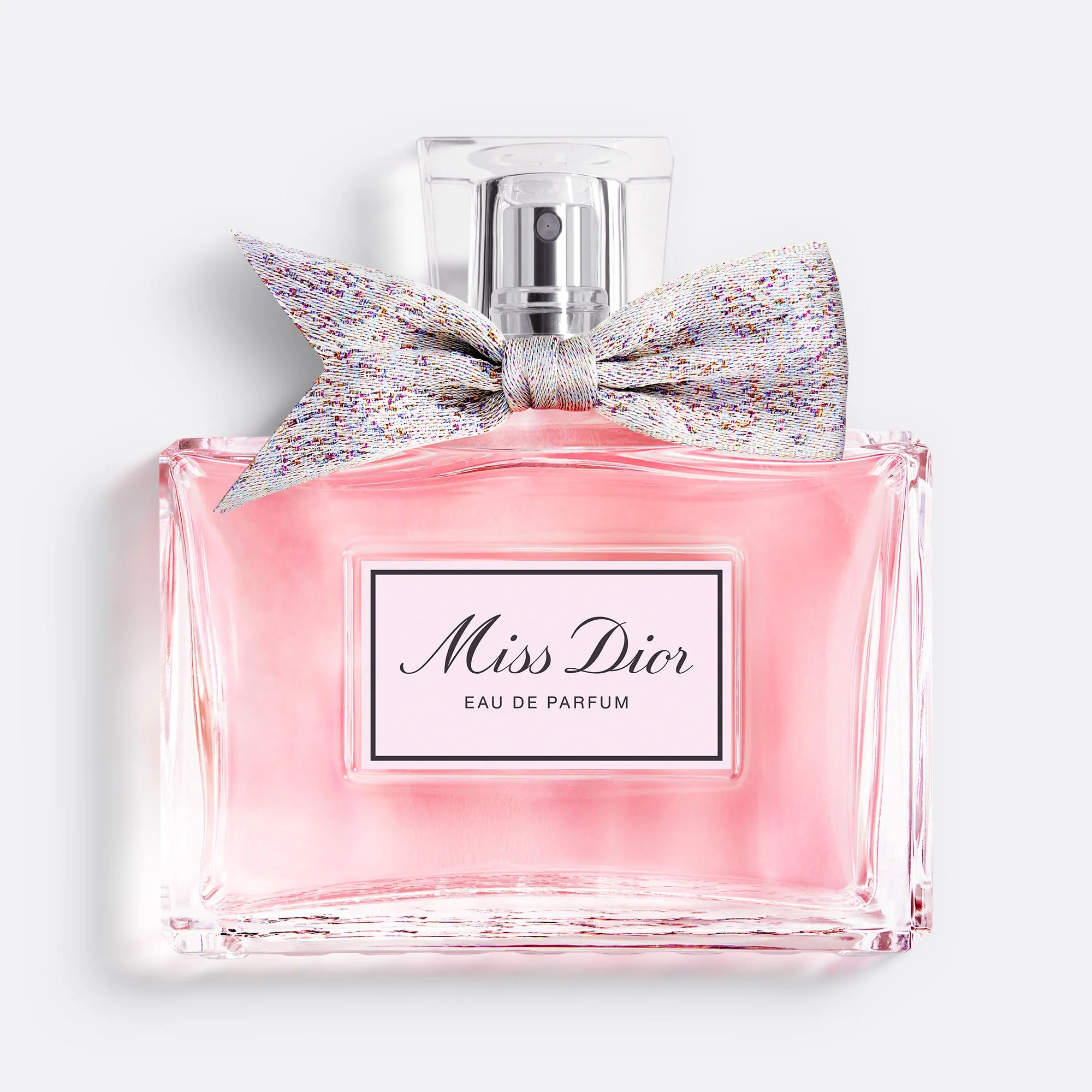 Miss Dior Eau de Parfum is decorated with a new haute couture bow made of poignard fabric with a unique assortment of flowers. Under the bottle, the emblematic motif of Miss Dior is engraved in the glass.