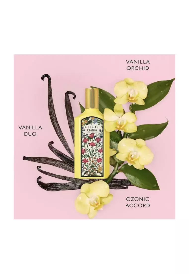 Gucci Flora Gorgeous Orchid is the first ozonic floral gourmand fragrance of the House, with an innovative approach that infuses this gourmand scent with a fresh perspective on vanilla. The creation weaves together the familiar sweetness of Vanilla with notes imparted through the Ozonic Accord. This unconventional fusion further highlights the luminous sensuality of Vanilla Orchid, elevating its gourmand richness to new heights. The creamy floral dimension that emerges from the fragrance is infused with airy brightness.