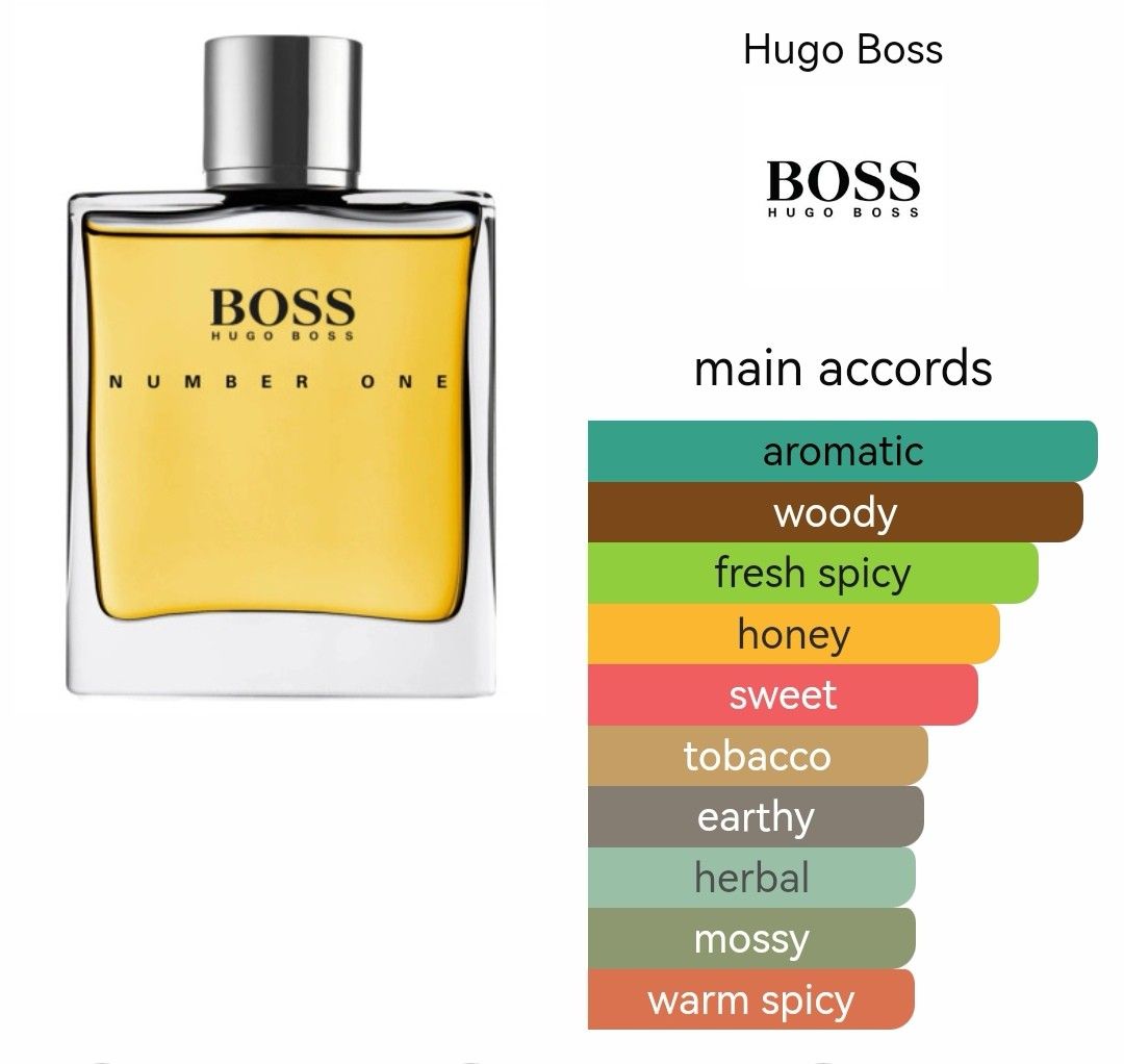 Boss Number One by Hugo Boss is a Aromatic Fougere fragrance for men. Boss Number One was launched in 1985. The nose behind this fragrance is Pierre Wargnye. Top notes are artemisia, green apple, juniper, basil, grapefruit, caraway, bergamot and lemon; middle notes are honey, lavender, orris root, jasmine, sage, lily-of-the-valley, rose and geranium; base notes are sandalwood, amber, patchouli, cinnamon, musk, oakmoss, cedar and tobacco.