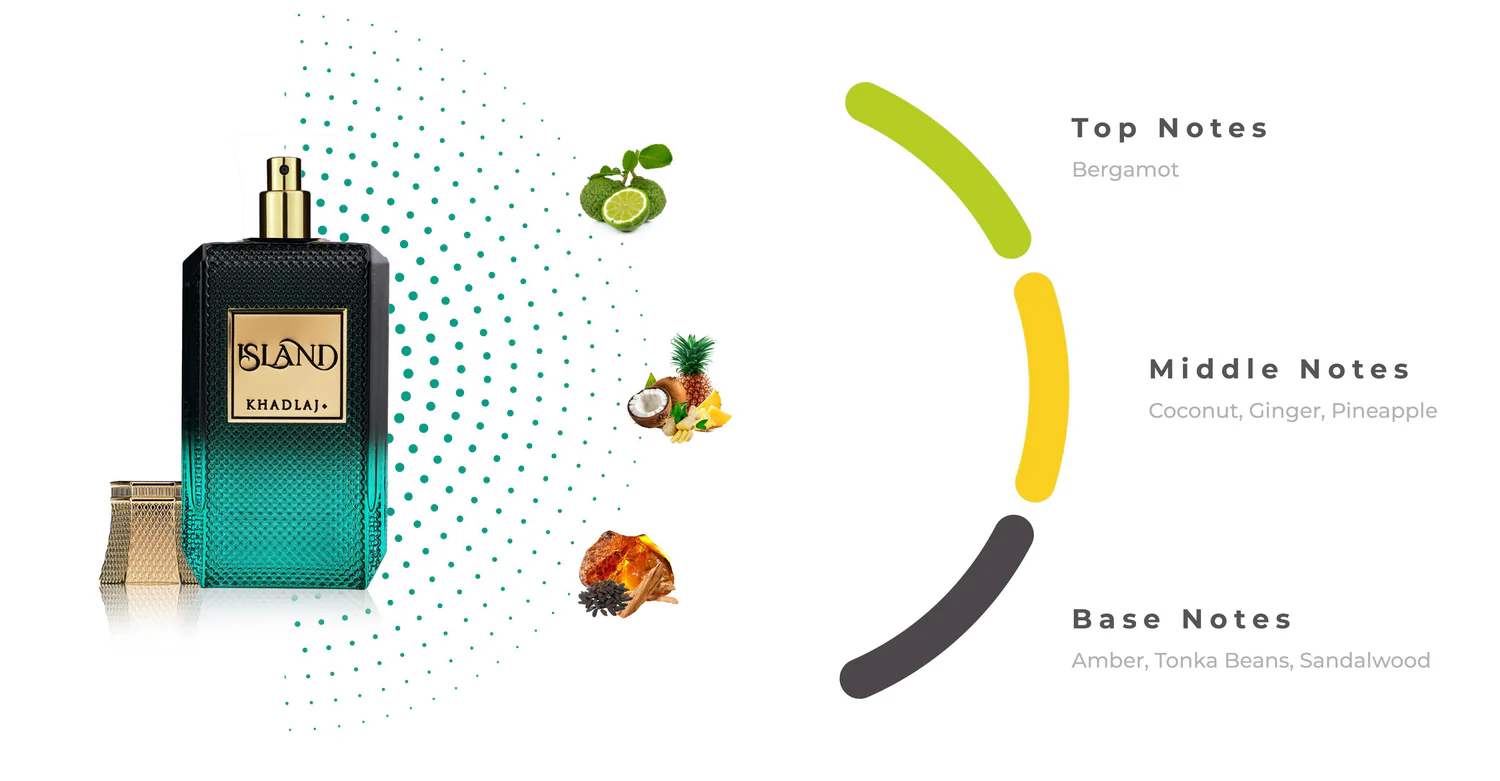 Island by Khadlaj Perfumes is a fragrance for women and men. Island was launched in 2024. Top notes are Pineapple, Iris, Ginger and Cypress; middle notes are Coconut and Woodsy Notes; base notes are Tonka, Amber, Sandalwood and Ambergris.