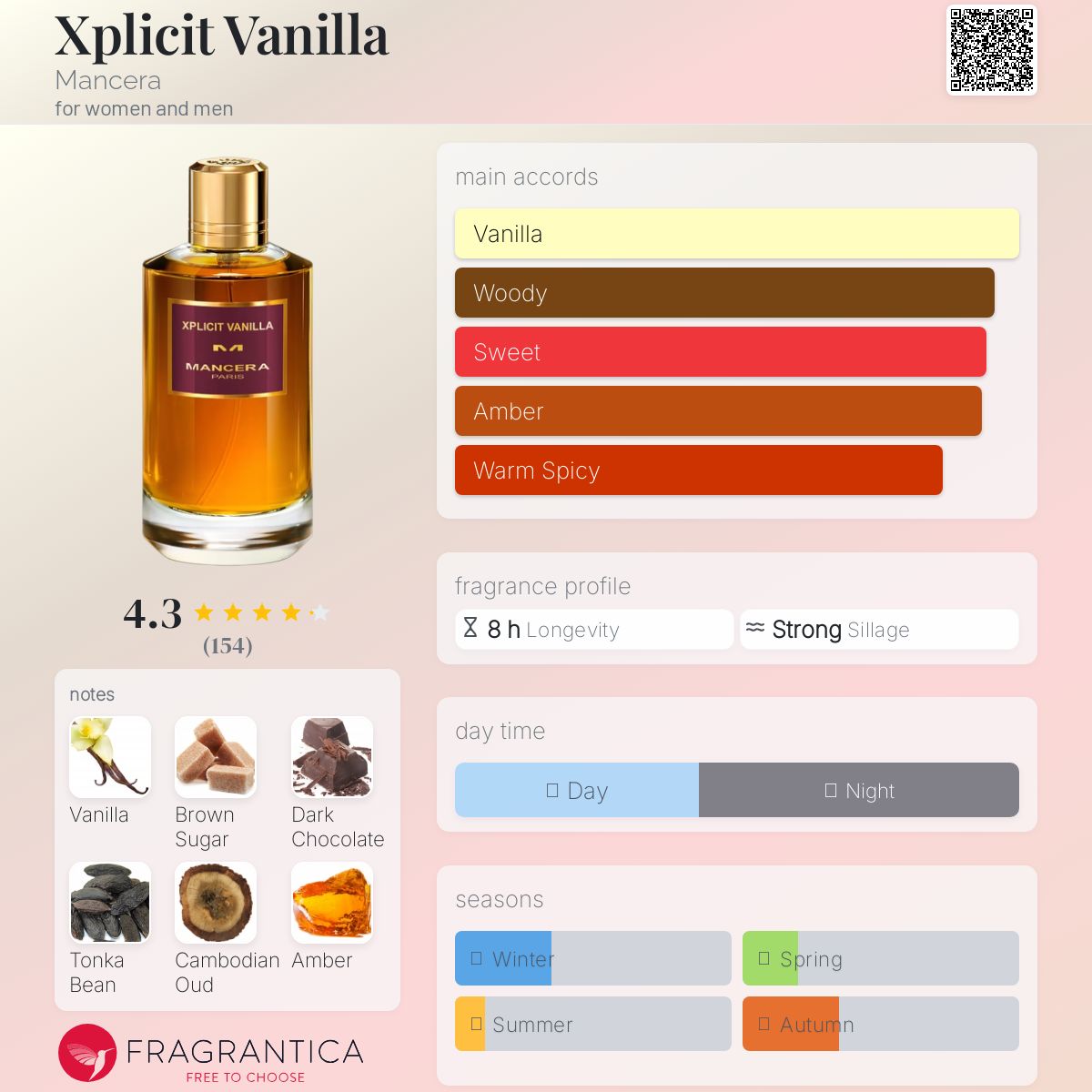 Xplicit Vanilla by Mancera is a Oriental Vanilla fragrance for women and men. This is a new fragrance. Xplicit Vanilla was launched in 2025. The nose behind this fragrance is Pierre Montale. Top notes are Mexican Vanilla and Dark Chocolate; middle notes are Brown sugar, Cambodian Oud, Australian Sandalwood and Cedarwood; base notes are Tonka Bean, Amber and Benzoin.