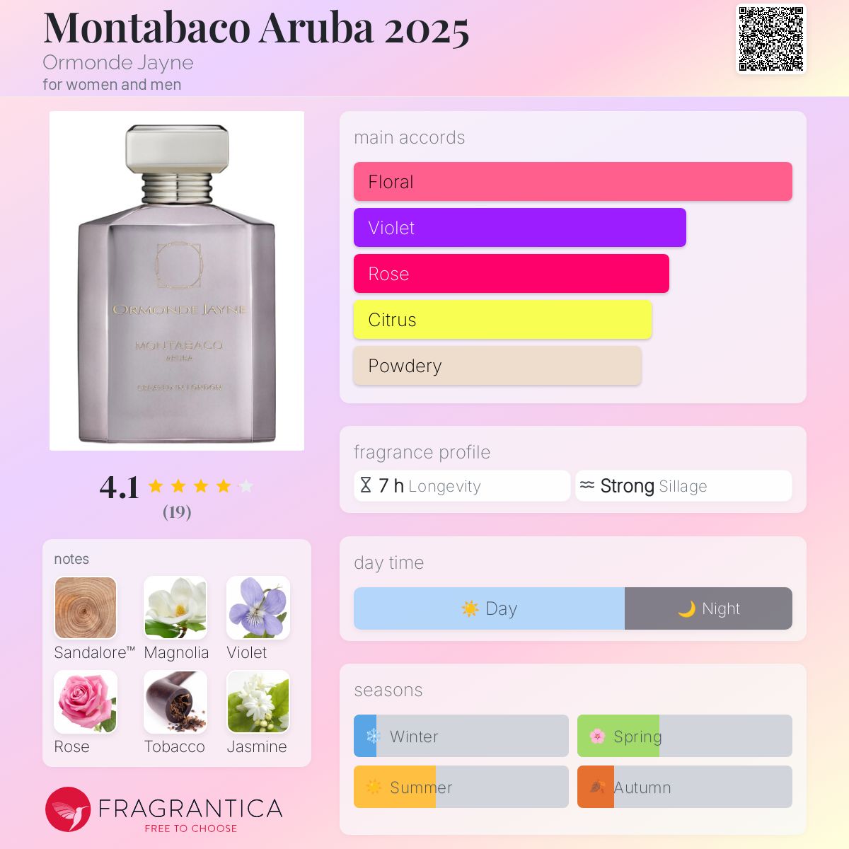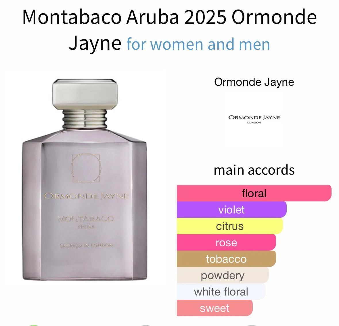 Montabaco Aruba 2025 by Ormonde Jayne is a Citrus Aromatic fragrance for women and men. This is a new fragrance. Montabaco Aruba 2025 was launched in 2025. Top notes are Grapefruit, Bergamot and Orange; middle notes are Violet, Magnolia, Rose and Jasmine; base notes are Sandalore™, Tobacco Leaf, Cardamom and Leather.