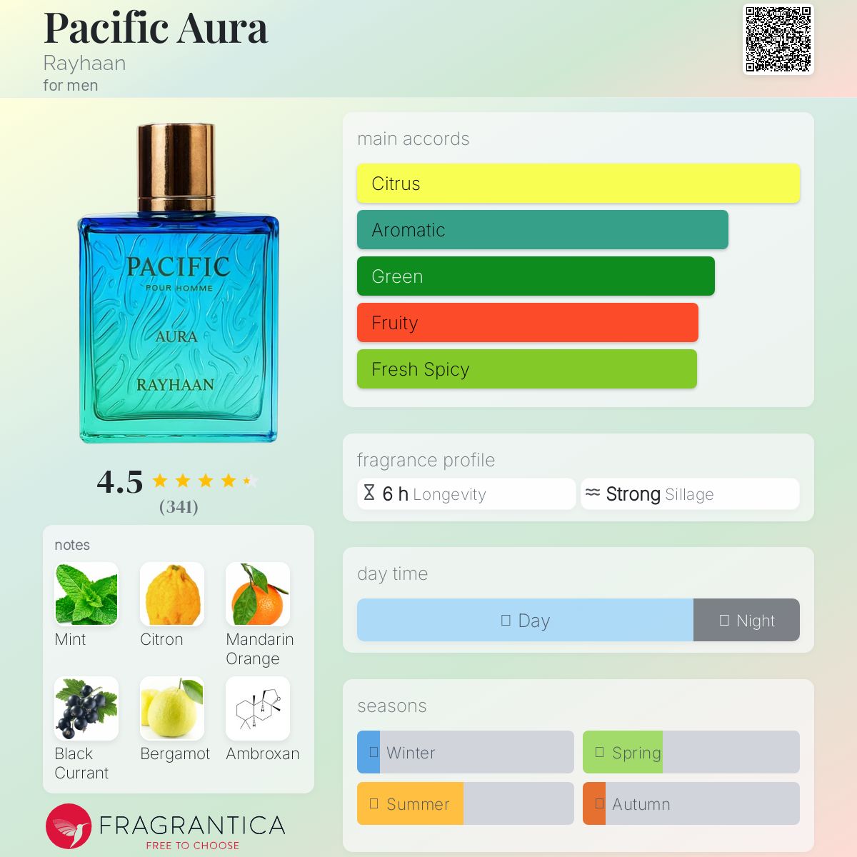 Pacific Aura by Rayhaan is a Aromatic Aquatic fragrance for men. This is a new fragrance. Pacific Aura was launched in 2025. Top notes are Mint, Citron, Mandarin, Black Currant, Bergamot and Coriander; middle notes are Basil, Carrot and Rose; base notes are Ambroxan, Fig and Amber.
