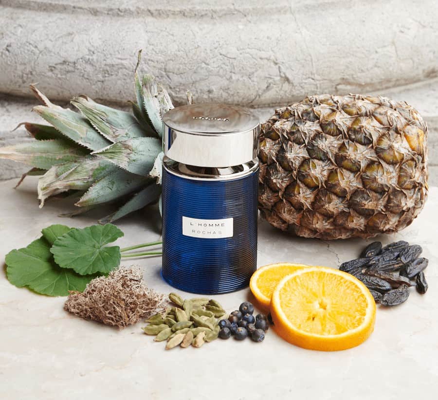 L’Homme Rochas belongs to the olfactory Oriental-Fougère family that combines fresh citrus notes with warm aromatic tones. It offers accords of bitter orange, pineapple, cardamom and oriental spices, notes of basil, geranium and juniper berries, complemented by a base of moss and tonka.