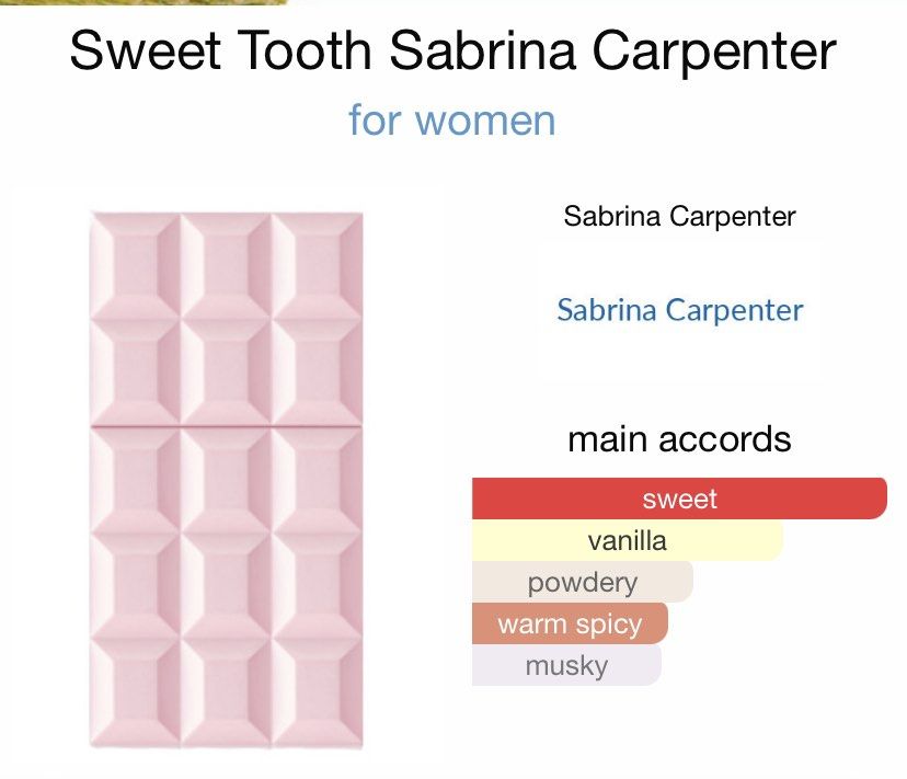 Sweet Tooth by Sabrina Carpenter is a Floral Fruity Gourmand fragrance for women. This is a new fragrance. Sweet Tooth was launched in 2022. The nose behind this fragrance is Gil Clavien. Top notes are Marshamallow, Chocolate, Candied Ginger and Bergamot; middle notes are Madagascar Vanilla, Coconut Milk and Jasmine; base notes are Whipped Cream, Sugar, Musk and Cashmere Wood.