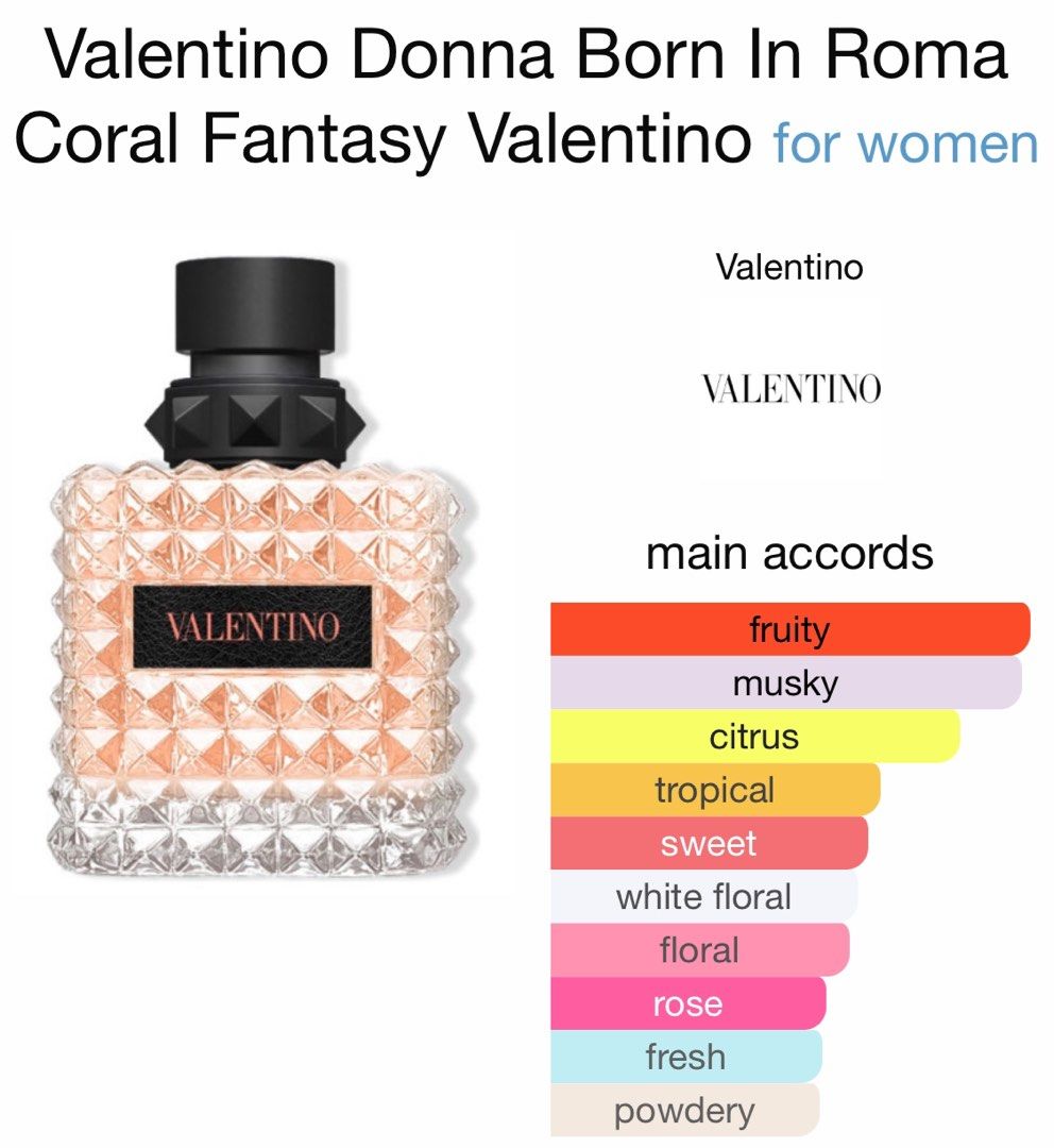 Valentino Donna Born In Roma Coral Fantasy by Valentino is a Floral Fruity fragrance for women. This is a new fragrance. Valentino Donna Born In Roma Coral Fantasy was launched in 2022. Valentino Donna Born In Roma Coral Fantasy was created by Nadege le Garlantezec and Jacques Huclier. Top notes are Kiwi and Brazilian Orange; middle notes are Rose, Ambrette (Musk Mallow) and Indian Jasmine; base notes are White Musk and Texas Cedar.